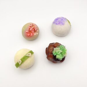 つつじ色(左上)創作練り切り、中は小豆こし餡